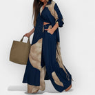 Este conjunto bicolor combina elegancia relajada con comodidad moderna, ideal para los días de verano con estilo. La blusa y el pantalón de corte amplio ofrecen libertad de movimiento, mientras que el estampado artístico aporta un toque distintivo a cada look.