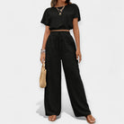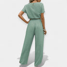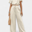 Este conjunto destaca por su ajuste holgado y comodidad total. El top corto con mangas abullonadas se combina armoniosamente con el pantalón de talle alto con cordón, creando un look estiloso con toques bohemios, ideal para los días más calurosos.