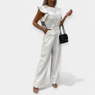 Este mono combina elegancia y comodidad, destacando con detalles como mangas de mariposa y cinturón que realza la cintura. Perfecto para ocasiones formales o casuales, es una pieza imprescindible.