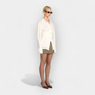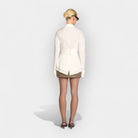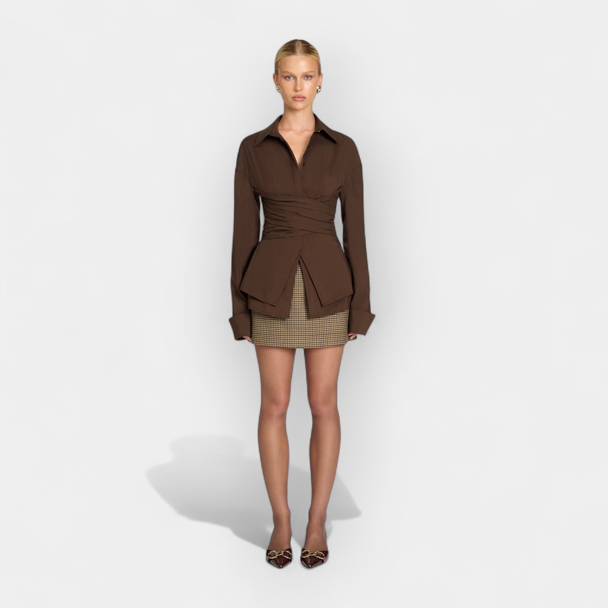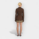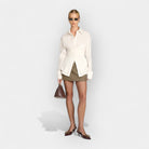 Una prenda elegante y versátil que combina un corte estructurado con detalles femeninos. El diseño ceñido en la cintura realza la silueta, mientras que el cuello y los puños largos aportan un toque moderno, ideal para looks formales o casual chic.