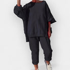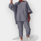 Este conjunto ofrece el equilibrio ideal entre comodidad y elegancia moderna. Con una textura suave y un ajuste relajado, es la elección perfecta para momentos de descanso en casa o para looks casual fuera de casa.