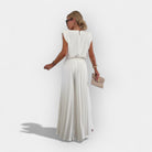Un conjunto elegante y práctico para mujeres que valoran el estilo y la comodidad. El top sin mangas con escote en V y el pantalón ancho crean una silueta armoniosa, mientras que el tejido ligero abraza suavemente el cuerpo para un uso cómodo durante todo el día.