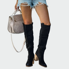 Women's knee-high boots in brown suede, featuring an elegant design that combines classic western style with modern lines. The high shaft hugs the leg, offering femininity and sophistication, while the stable heel provides height and comfort. A timeless piece that can be worn with dresses, skirts, or skinny jeans to create stylish and elegant looks.
