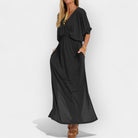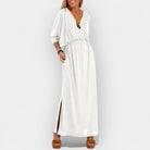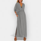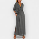 Este vestido largo combina una estética atemporal con total comodidad, ofreciendo elegancia sin restricciones. Su textura suave y su corte cuidadosamente diseñado envuelven el cuerpo de forma armoniosa, realzando la silueta de manera natural.